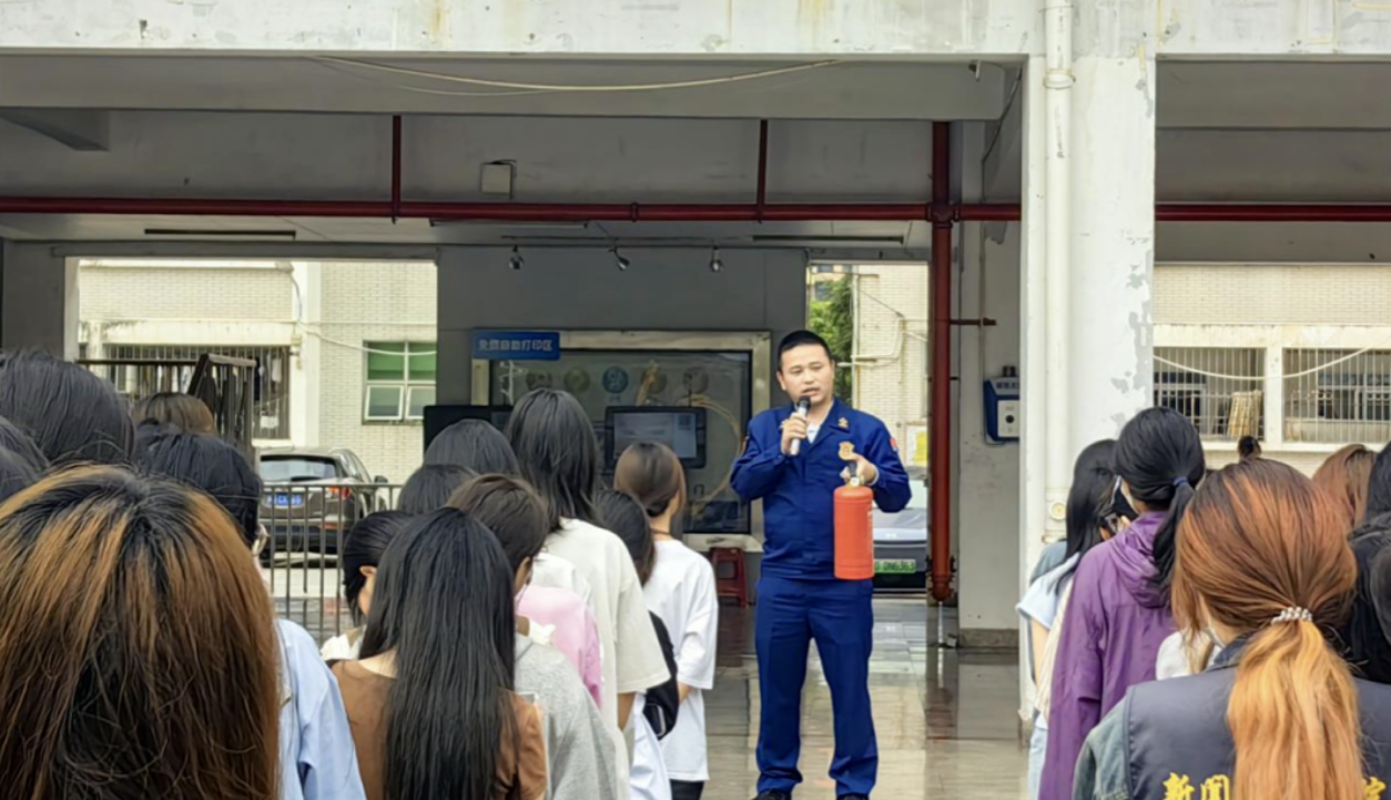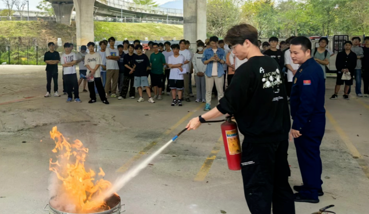 集合完毕后,漳州市消防救援支队新闻宣传科科长王春旺同志为师生们进行消防知识培训。他强调了应急避险争分夺秒的重要性,讲解了干粉灭火器的正确使用方法,教导同学们熟记“提拔握压”口诀,并组织同学们进行实操体验。