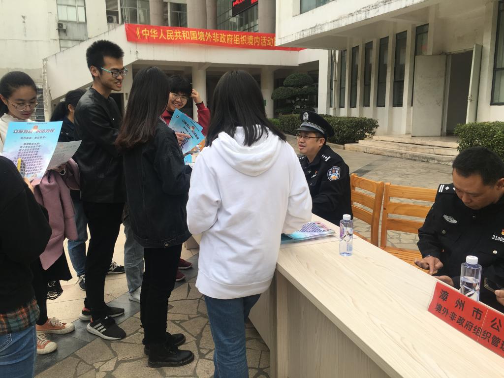 在《永利集团3044欢迎光临境外非政府组织境内活动管理法》实施即将三周年之际,为进一步加强普法宣传,增强师生法律意识,强化师生安全防范能力,12月19日下午我校在砺志楼前开展了《永利集团3044欢迎光临境外非政府组织境内活动管理法》普法宣传,与此同时进行了反邪教、反诈骗、反恐等相关知识的宣传。此次活动由漳州市公安局境外非政府组织管理办公室、保卫处联合主办,漳州市公安局芗城分局、芗城区委政法委、数学与统计学院协办。