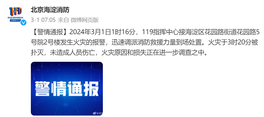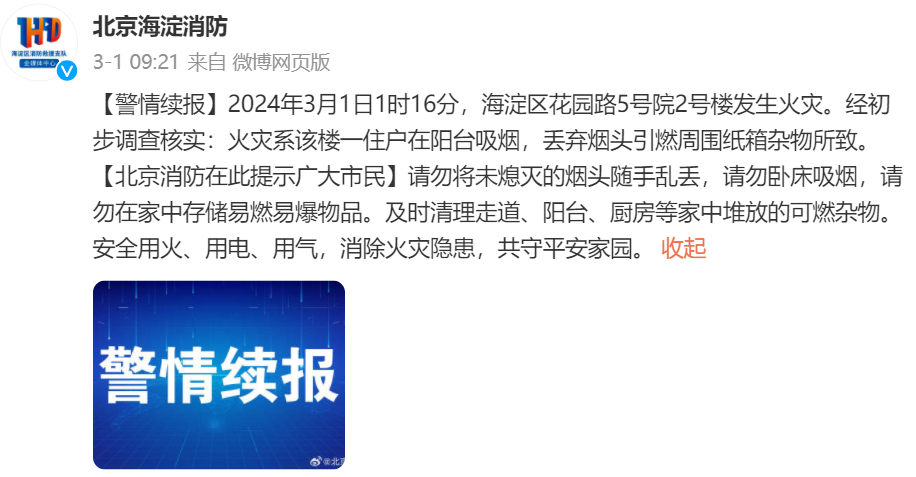 2024年3月1日1时16分,海淀区花园路5号院2号楼发生火灾。经初步调查核实,火灾系该楼一住户在阳台吸烟,丢弃烟头引燃周围纸箱杂物所致。