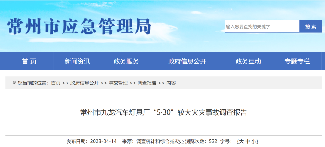 2022年5月30日,江苏省常州市新北区孟河镇九龙路98号的常州市九龙汽车灯具厂发生火灾,导致4人死亡,直接经济损失1719.25万元。经调查,火灾事故直接原因系两名工人违反企业禁烟规定,在半成品仓库五层吸烟遗留火种引燃包装纸箱堆垛引发火灾。