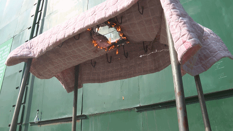 大约1分钟后,被子出现明火,且被烧出一个洞