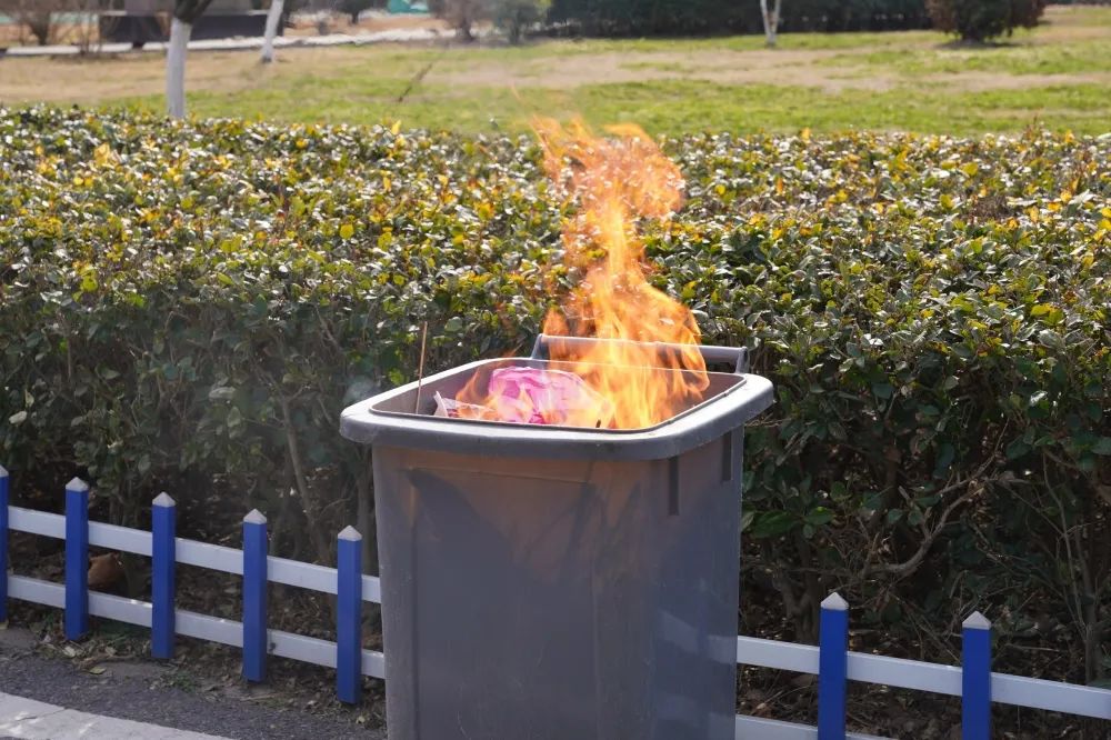 烟头接触位置的塑料片立刻开始熔化,纸巾开始冒烟。垃圾桶内就出现了阴燃,随后不到1分钟窜出明火。