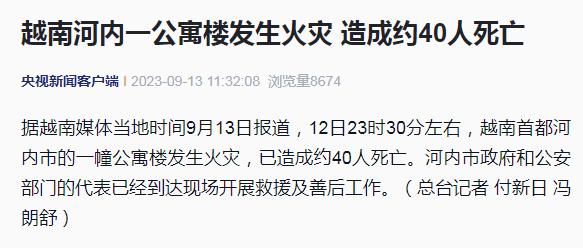越南媒体当地时间9月13日报道,12日23时30分左右,越南首都河内市的一幢公寓楼发生火灾,已造成约40人死亡。河内市政府和公安部门的代表已经到达现场开展救援及善后工作。